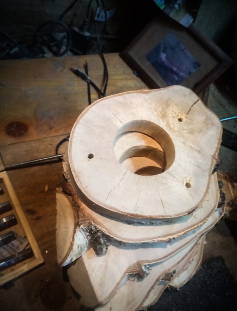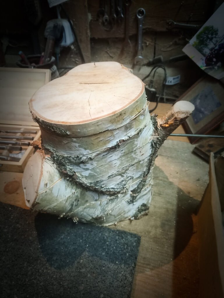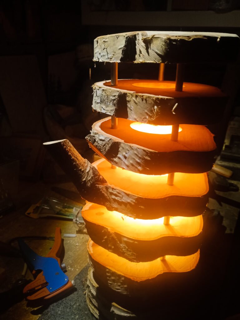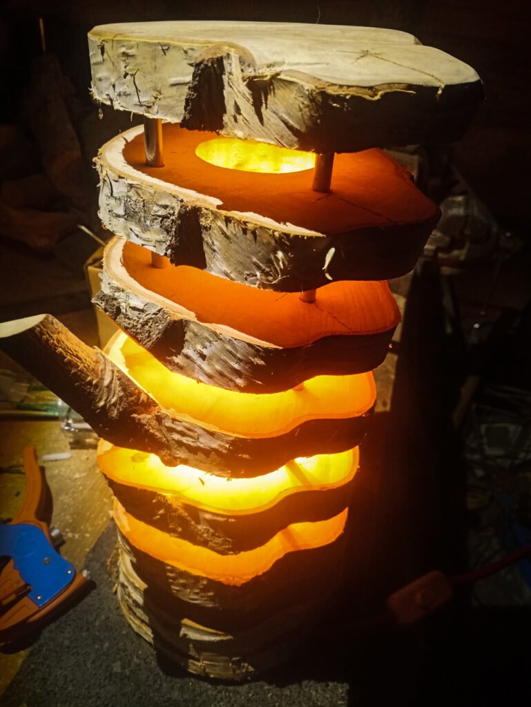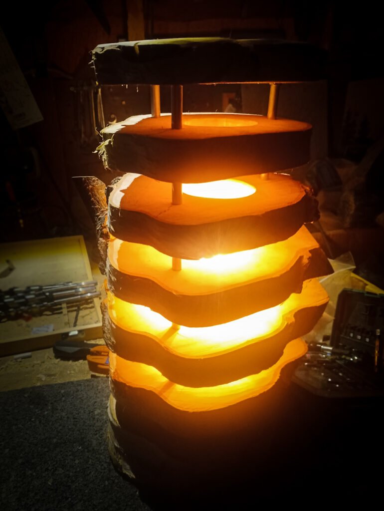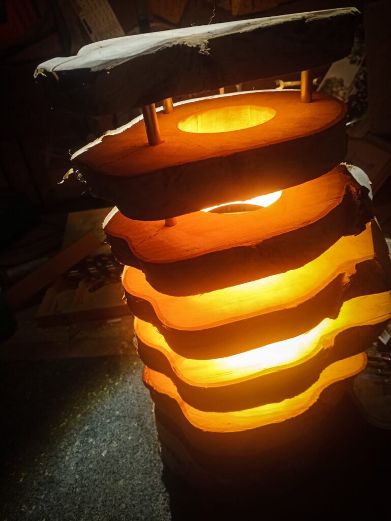 Die Leuchte Etú besteht aus einem sequentiell zerteilten Stück Birkenstamm mit einer Ausfräsung für Leuchtmittel