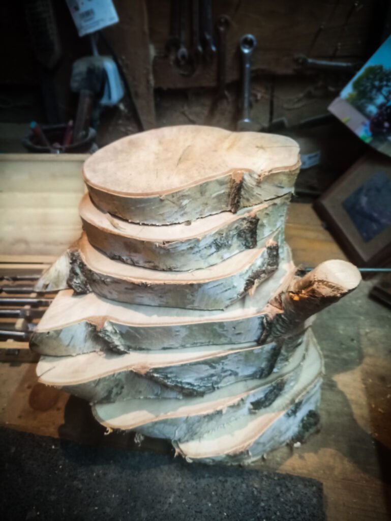 Ein massives Birkenholz Stammstück wird in sequentiell mit der Japansäge in gleich große Scheiben zerlegt. Die Verwendung jeglicher anderer Schnitttechnik hätte einen zu hohen Materialverlust zur Folge und würde die Kontinuität der Erscheinung stören.